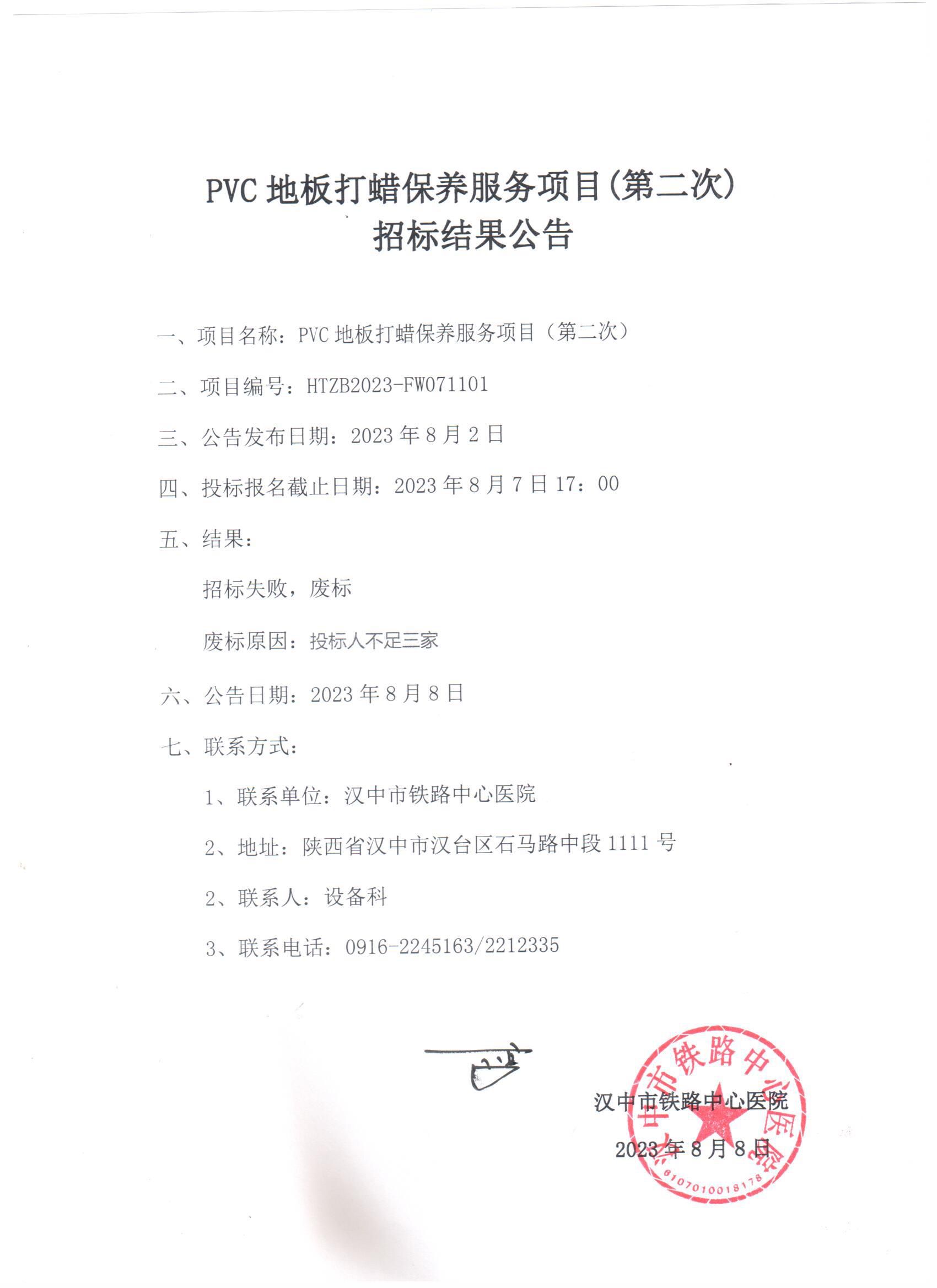PVC地板打蜡保养服务项目(第二次)招标结果公告
