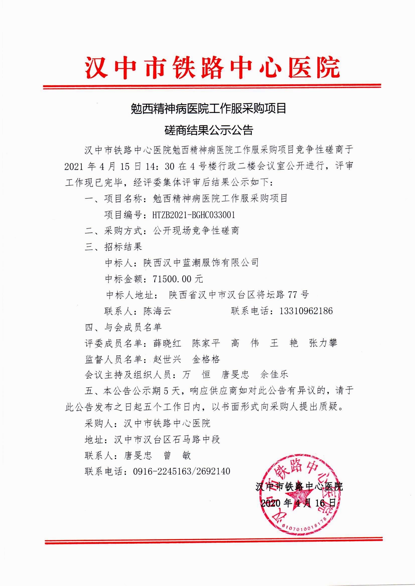 勉西精神病医院工作服采购项目磋商结果公示公告